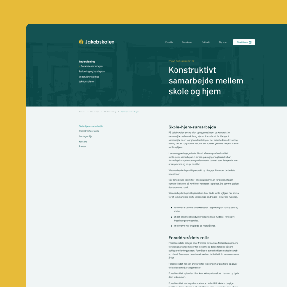 Forældrene til børnene på Jakobskolen blev tidligere mødt af en forældet og uorganiseret hjemmeside, hvor de ikke kunne finde de informationer, de søgte efter. Nu kommer de ind på en moderne hjemmeside, hvor brugervenlighed og en gennemtænkt formidling af informationer står centralt, og hvor Jakobskolen fremstår som den moderne skole, den er.